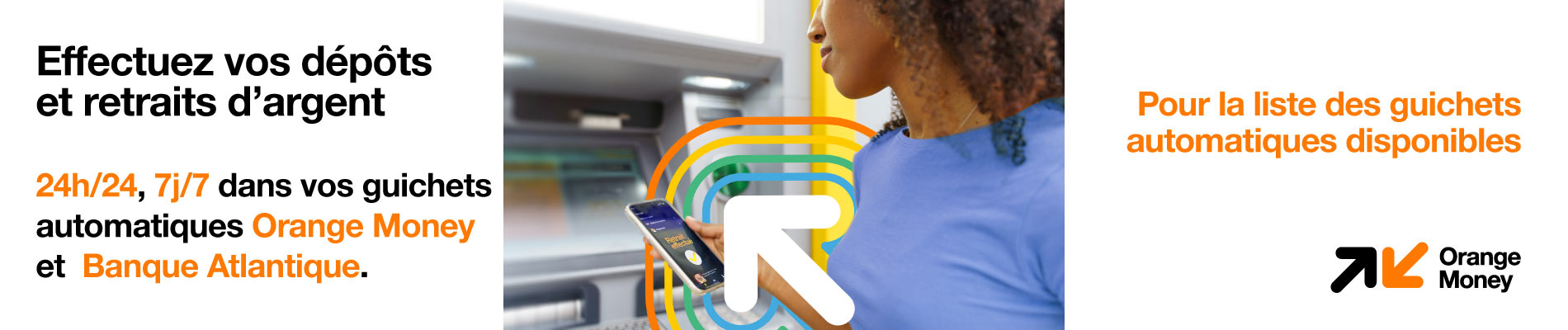 Chez Orange, nous savons que vous devez pouvoir disposez de votre argent où que vous soyez. C’est pourquoi nous vous proposons des Guichets Automatiques de Billets Orange Money.