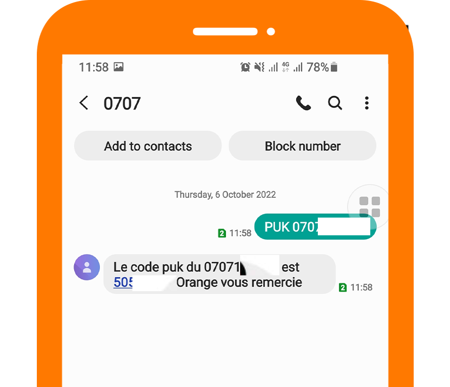 Attention : Après 10 saisies erronées de votre code PUK, votre carte SIM sera grillée et deviendra inutilisable. Pour accéder aux service Orange depuis votre mobile, un renouvellement de la carte SIM sera nécessaire.