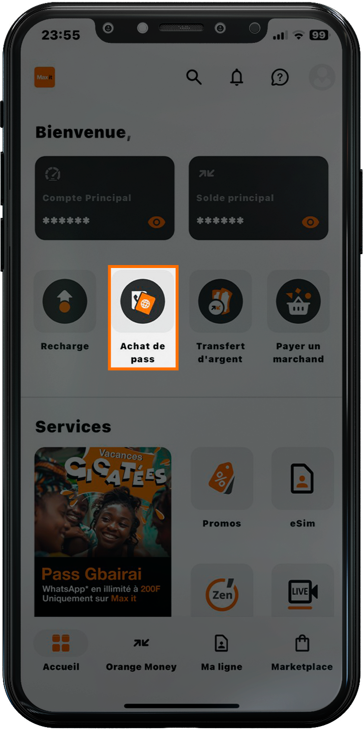 Téléchargez l’application Max It et connectez-vous en utilisant votre numéro de téléphone Orange