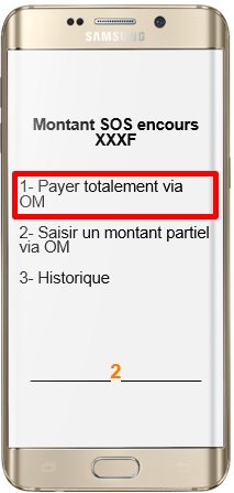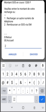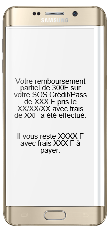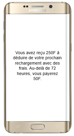 Le service SOS Crédit propose différents montants de prêt : 250 F, 500 F et 1 000 F. Pour un prêt de 250 F, si le remboursement est effectué dans les 3 jours lors de la prochaine recharge, aucun frais n’est appliqué. Au-delà de 3 jours, un frais de service de 20 % s’ajoute, portant le remboursement à 300 F. De même, un prêt de 500 F doit être remboursé à 600 F (500 F + 100 F de frais), tandis qu’un prêt de 1 000 F doit être remboursé à 1 200 F (1 000 F + 200 F de frais).