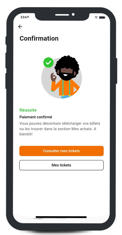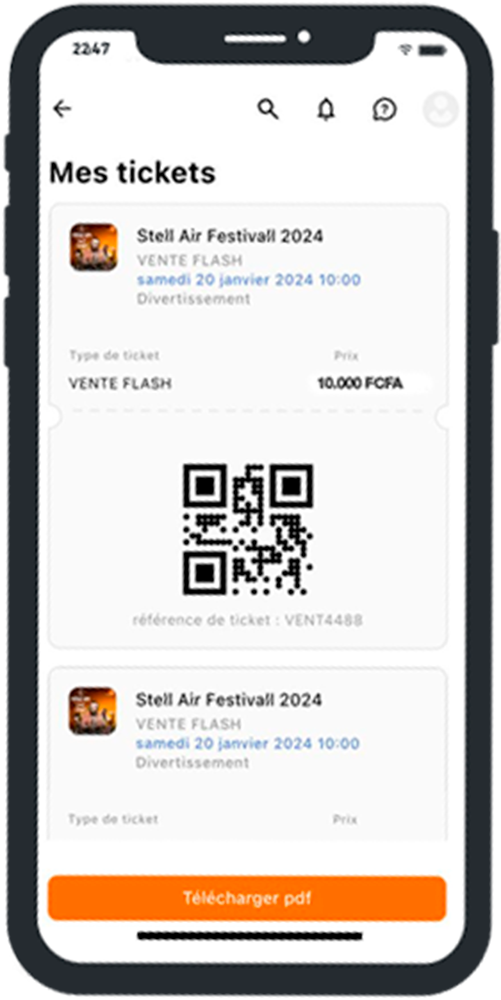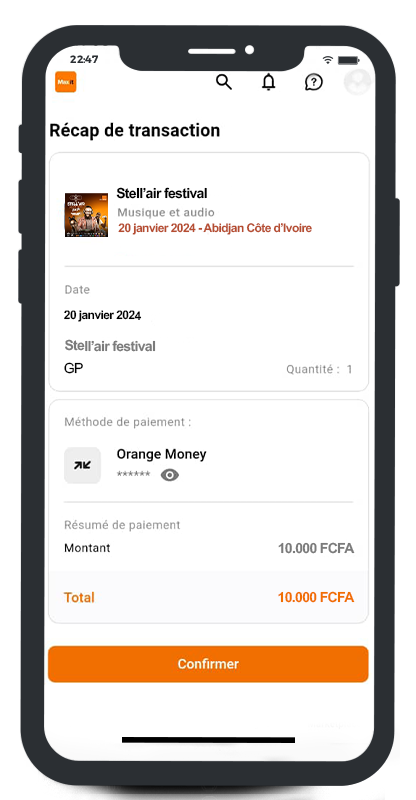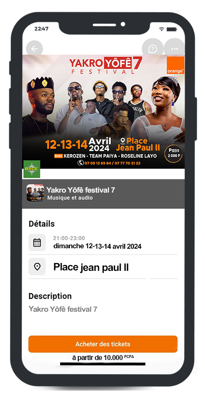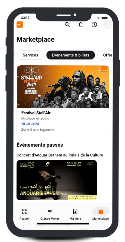 Achète tes tickets d'Événements à Tout Moment !Grâce à notre marketplace accessible 24h/24 et 7j/7, tu peux désormais acheter tes billets d'événements à tout moment, où que tu sois. ton compte Orange Money suffit pour une expérience d'achat fluide et sans tracas.