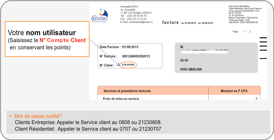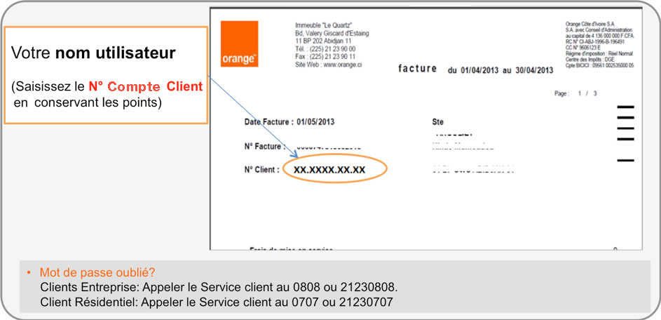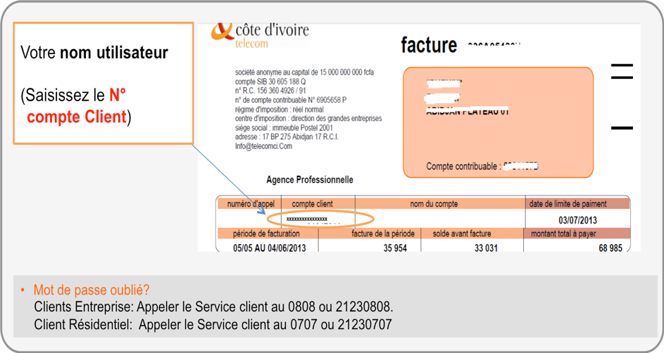 Vous souhaitez consulter votre facture au format électronique mais vous ne parvenez pas à y accéder. L'identifiant et le mot de passe doivent être ceux du contrat pour lequel vous souhaitez consulter la facture. En fonction de votre offre mobile, fixe ou internet retrouver votre nom d’utilisateur sur votre facture
