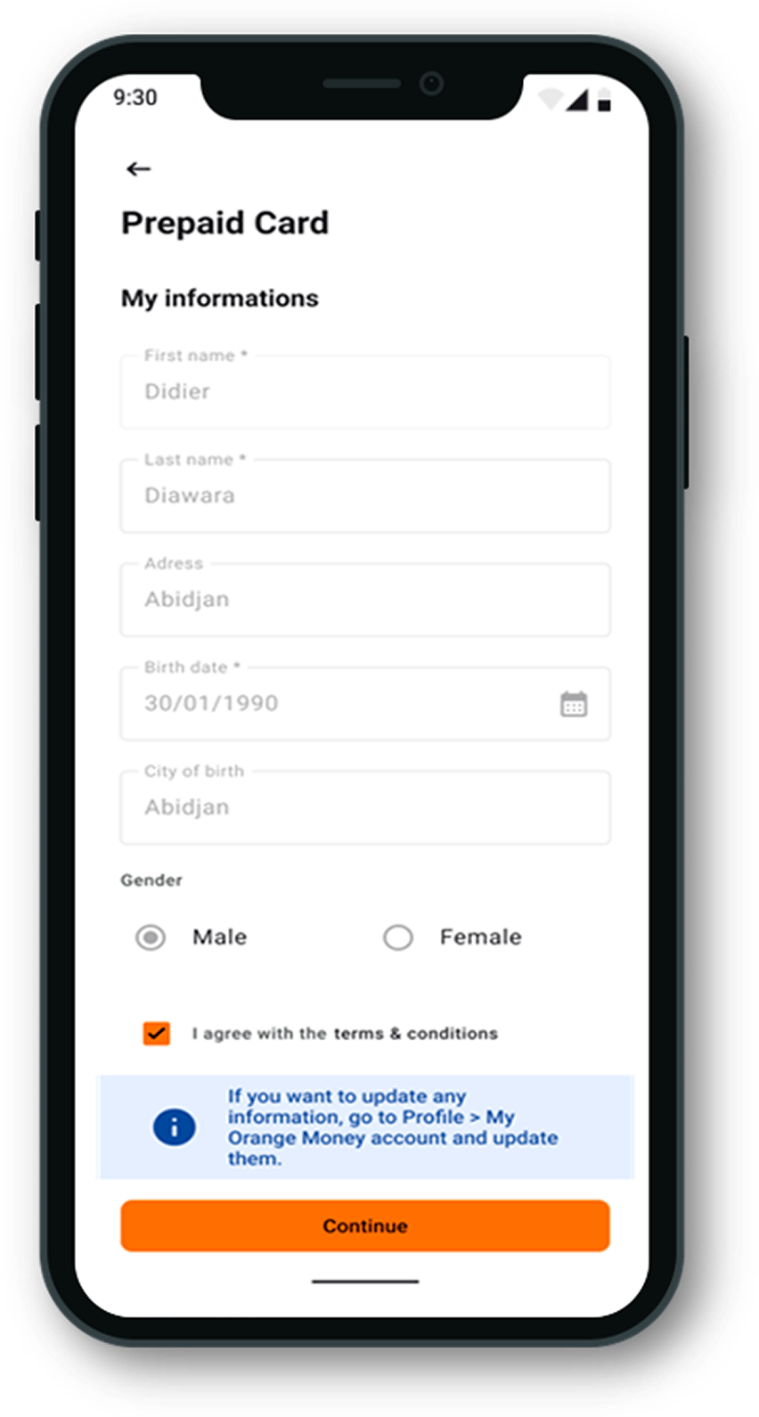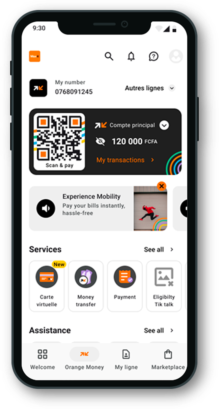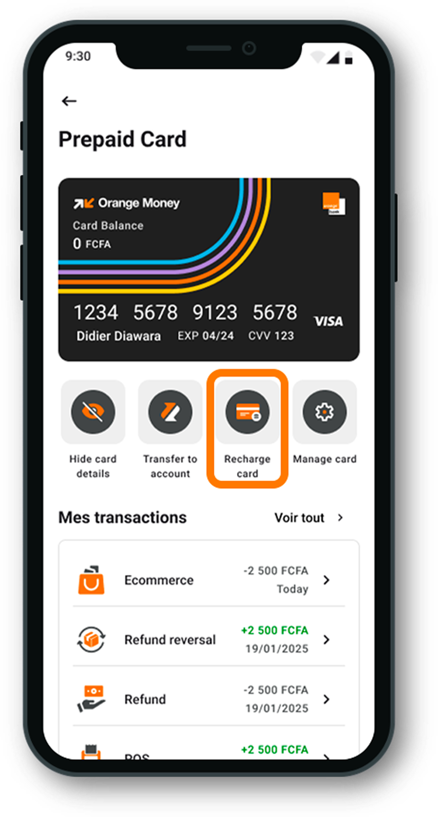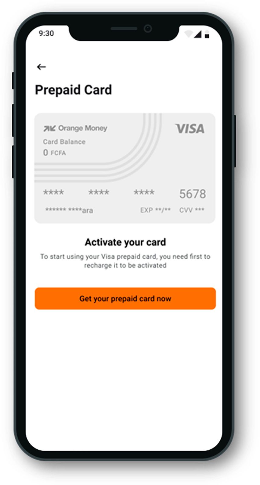 L’utilisateur accède à la carte virtuelle depuis la section Services de la page Orange Money.