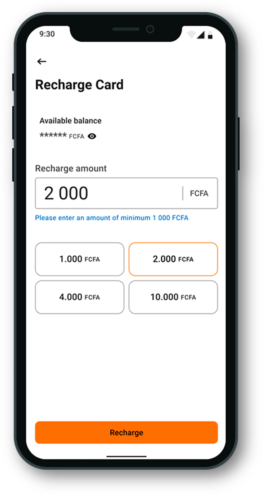 Pour recharger sa carte, l’utilisateur clique sur le raccourci "Recharger ma carte" et sélectionne le montant souhaité.