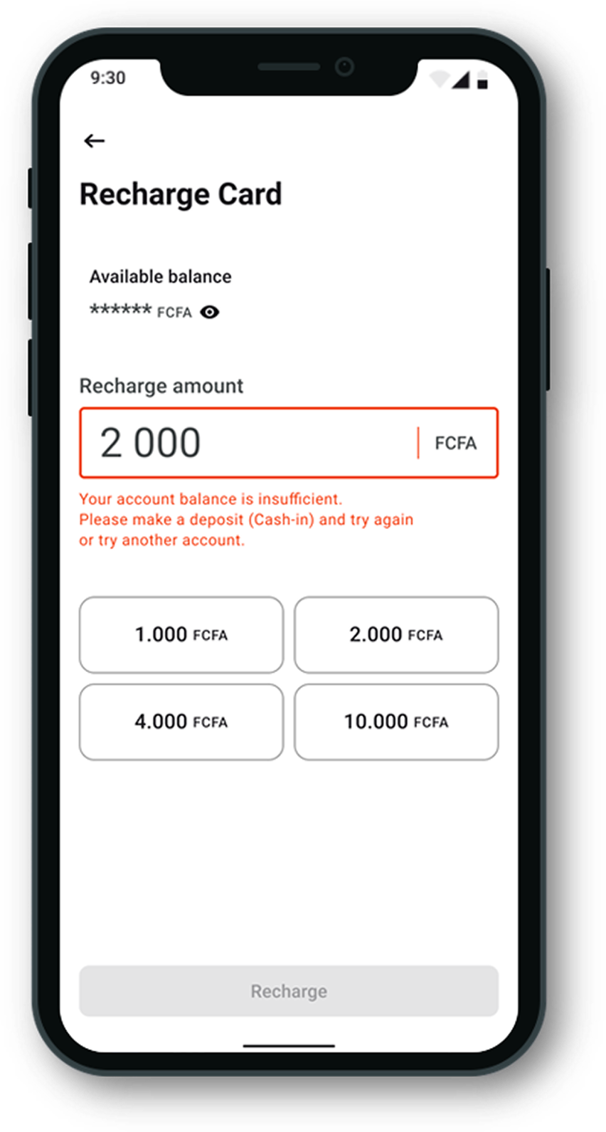 Si le montant saisi dépasse le solde disponible sur le compte Orange Money, un message d’erreur s’affiche et le bouton "Recharger" devient inactif.